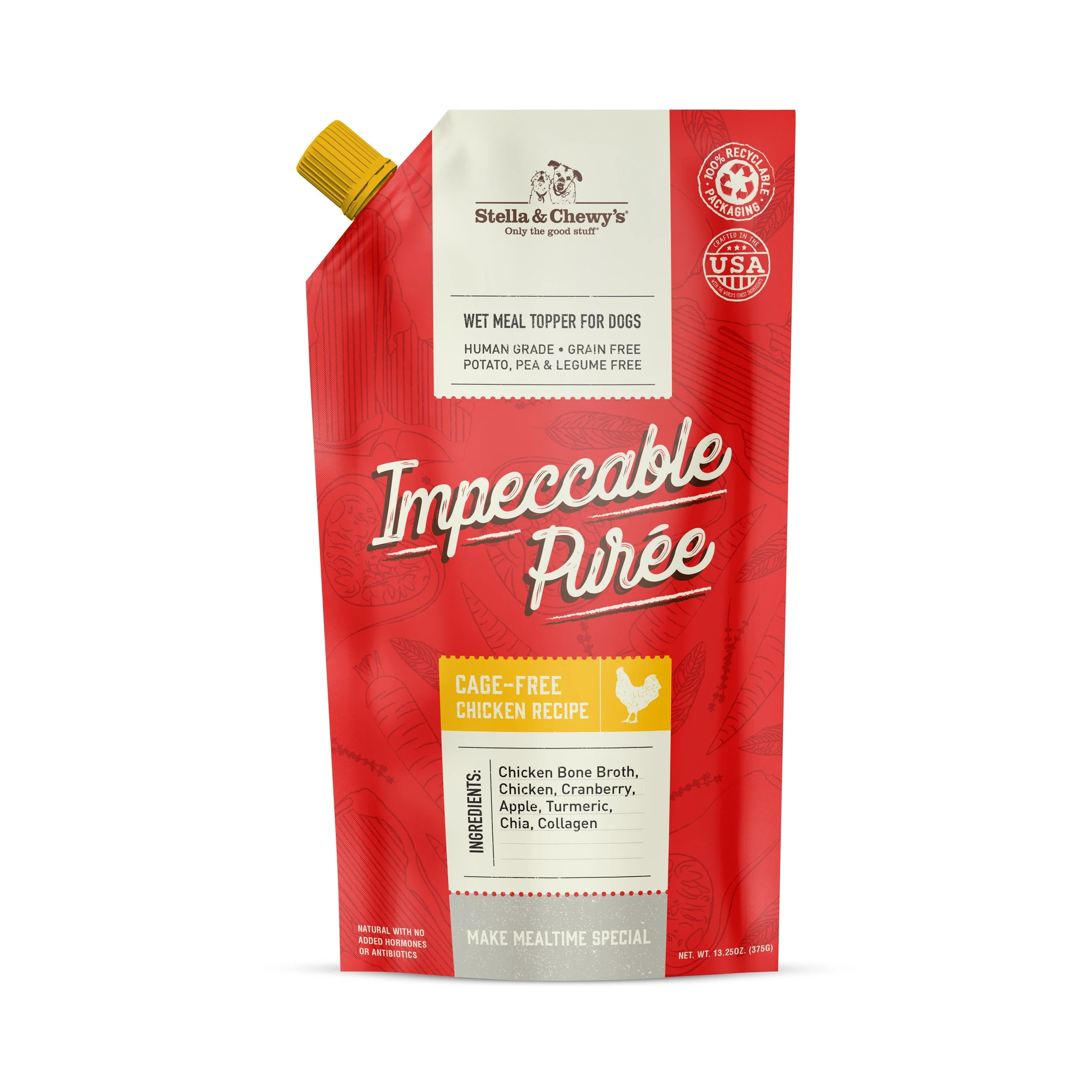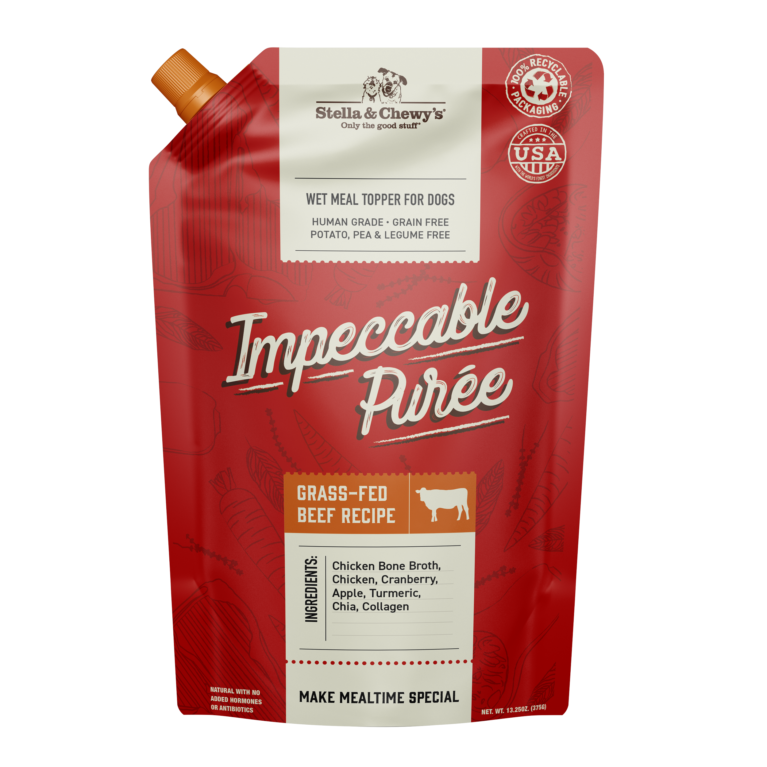 Impeccable Puree leaned the hardest into a butcheshop aesthetic of the three products, we needed to highlight simplicity of ingredients and simplicity of recipe. We took inspiration from modern simple food products like the RX bar, placing ingredients front and center on pack. We utilized the butcher shop language with the long tag element that framed all our information, plus hinted to the center lockup shield element that is in Stella’s DNA. The illustrations in the background are hand done and highlighted ingredients in each recipe.